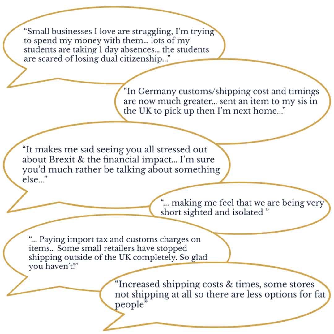 As well as these issues there have been cancelled orders from wholesale customers/retailers and rejected/returned orders solely because of consumer-faced Brexit costs. The UK Fashion industry is also heavily reliant on Freedom of Movement within the EU for models, designers and garments.