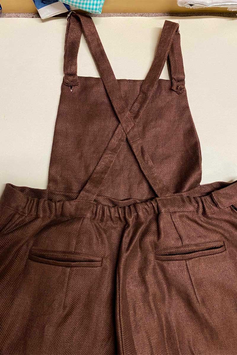 Features: tapered bib, button fastenings, round pockets, elasticated waistband, hook + bar fastening, back bound pockets