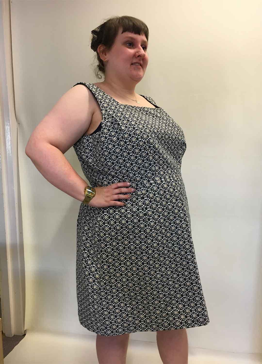 Features: square neckline, sleeveless, cotton bodice lining + side seam pockets