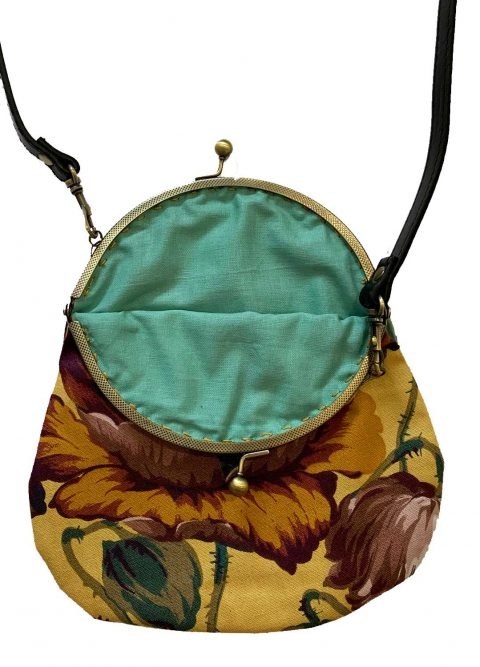 This yellow vintage style floral handbag is handmade using a yellow floral cotton and is lined with a light blue cotton.